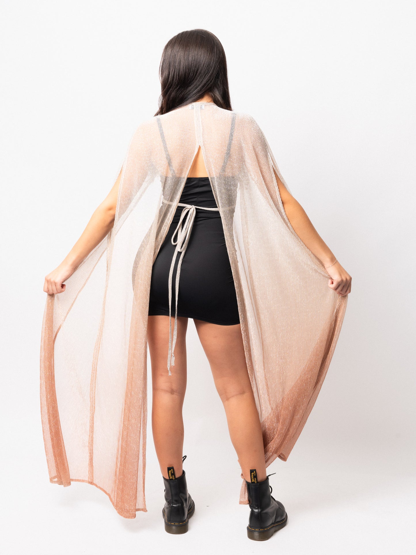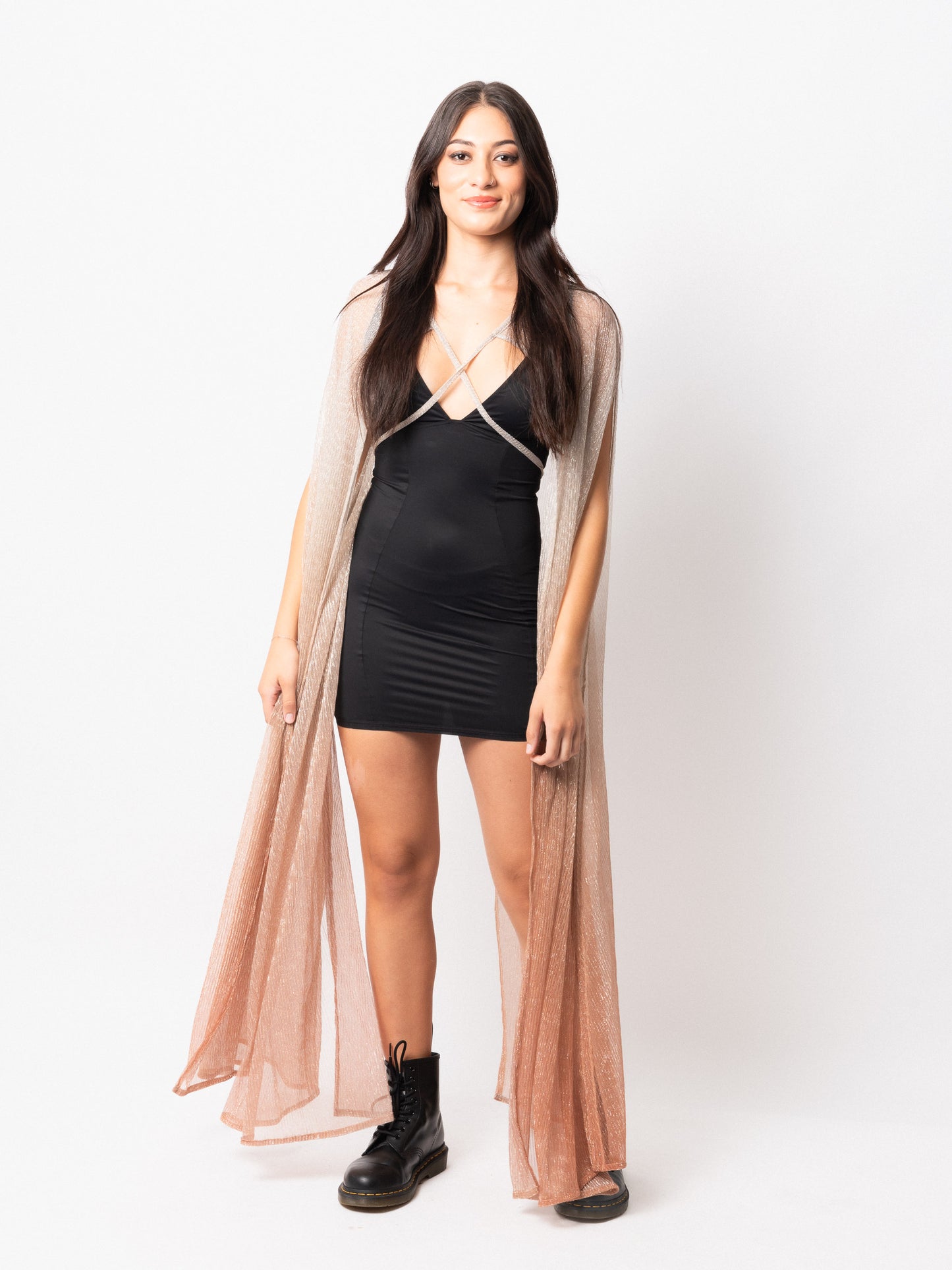 Let’s go dancing! The FLOCK Wing Cloaks is definitely a statement. These bold garments feature a maxi length, glitter pleated mesh fabric throughout with draped shoulders, back slit for extra drama and long straps that cross at front, wraps around your body and ties at your back in a bow.
