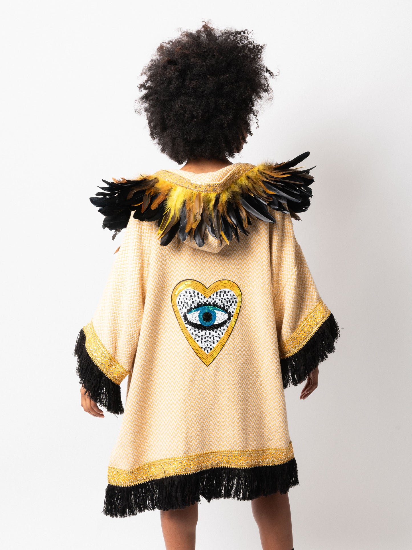 Mellow Yellow Fellow! Fresh, fun, on trend festival feather kaftan, sure to stand out of the crowd and turn heads as you pass by. Featuring a hood with a variety of feathers hand & machine stitched to the hem, relaxed silhouette, wide sleeves and open front that can be tied up. Each one is a one-of-a-kind piece designed with different trims, fabric, embroidery and embellishments.