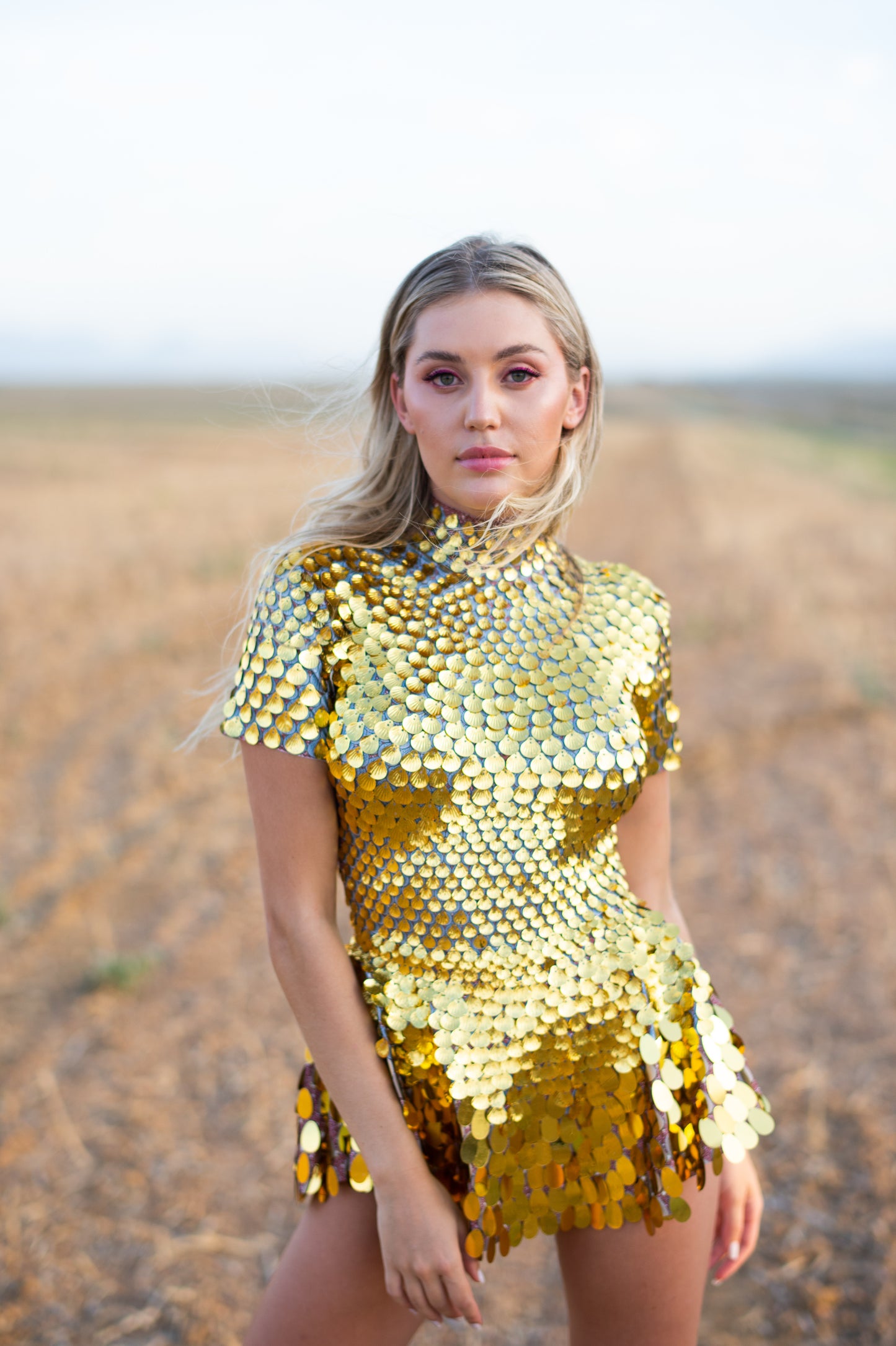 Golden Girl! The Find Global Armor Party Dress is your ultimate showstopper. This ultra-sexy mini dress features a built-in bodysuit to keep you covered while you dazzle at your favorite festival, birthday party, or night out. Adorned with delicate sequin shell details scattered across the fabric, it’s a perfect blend of sparkle and sophistication.