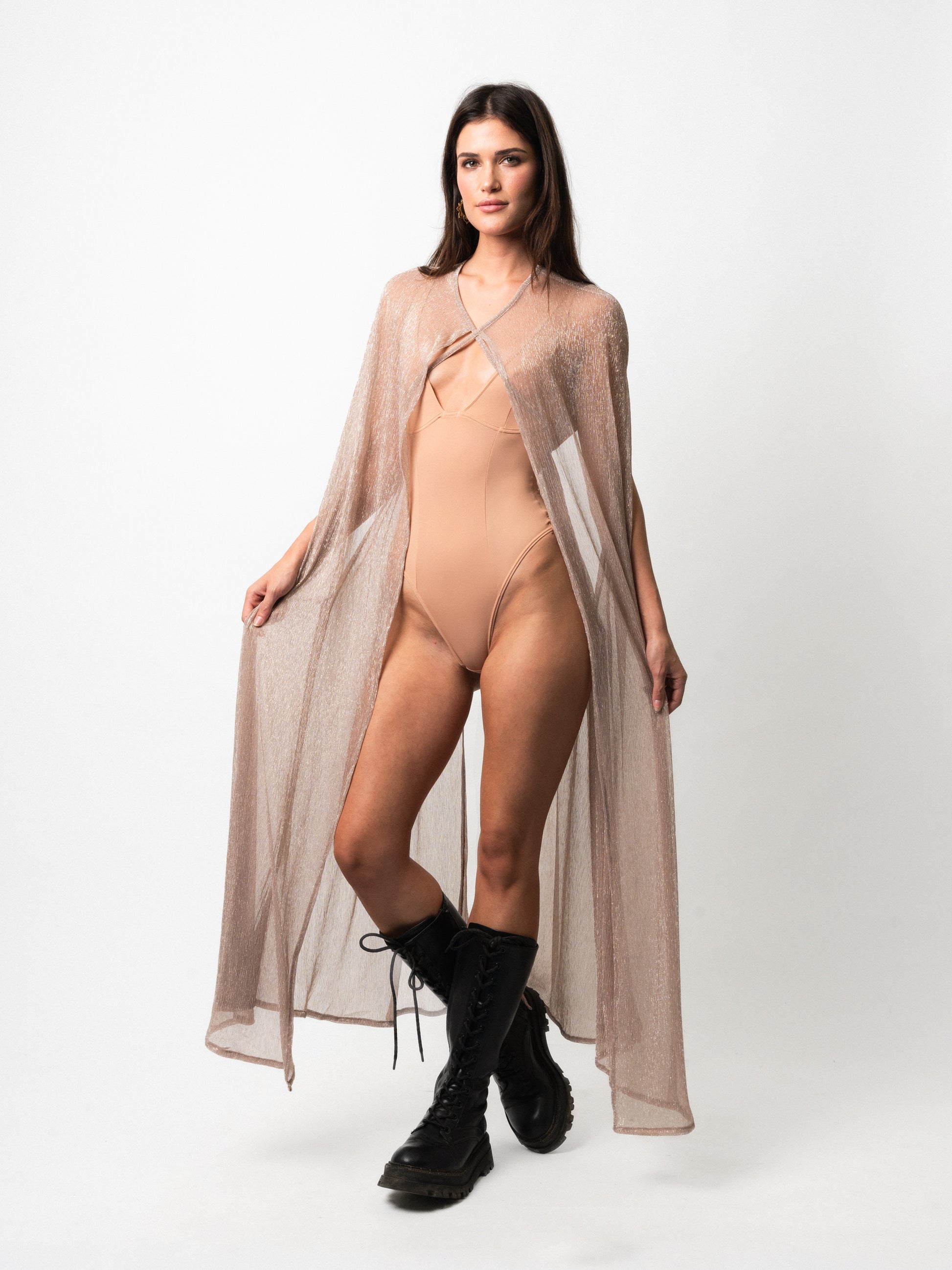 Let’s go dancing! The FLOCK Wing Cloaks is definitely a statement. These bold garments feature a maxi length, glitter pleated mesh fabric throughout with draped shoulders, back slit for extra drama and long straps that cross at front, wraps around your body and ties at your back in a bow.