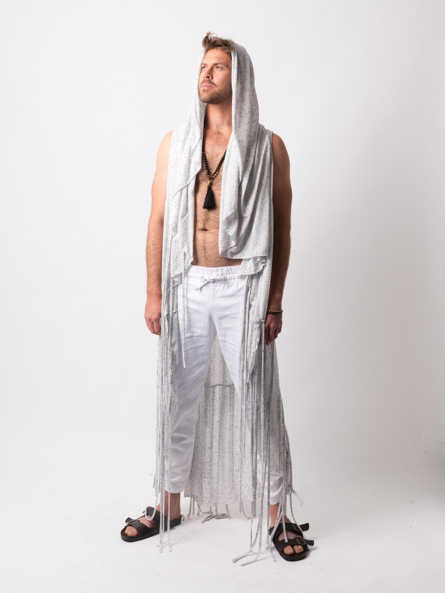 Dusty Dreams! The FLOCK Tankwa Duster is a free-size hooded masterpiece with oversized armholes for breathability on hot days. This maxi-length duster features fabric strips hanging from each panel, creating a Desert Mad Max vibe. The versatile lapel can be worn as a hood, draped over your arms, or swung to the side. Perfect for festivals, this multi-purpose piece is destined to be your new favorite. Get ready to look epic, boys!
