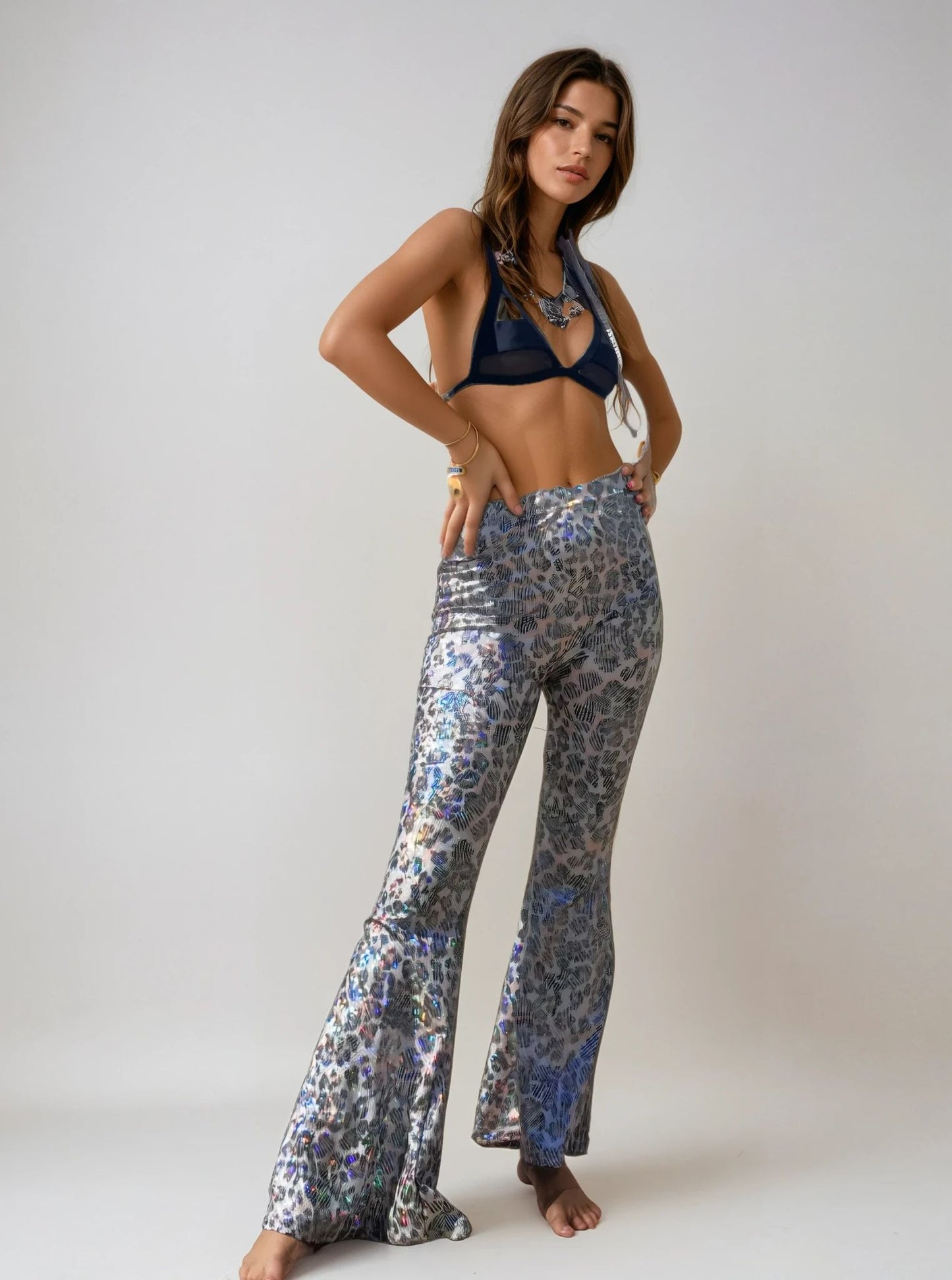 Meet the Limited-edition Flock Luneth Bell Bottoms, where holographic magic meets fierce feline energy! Made from high-quality, thick, and stretchy holographic Lycra, these bells are designed to hug you in all the right places while giving your bum that extra ooh la! The high-waisted fit and perfected flare ensure that every step, twirl, and strut turn heads. And let’s talk about that leopard print detail. A subtle roar that says, I was born to stand out!