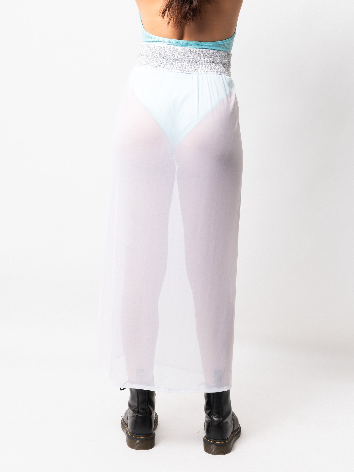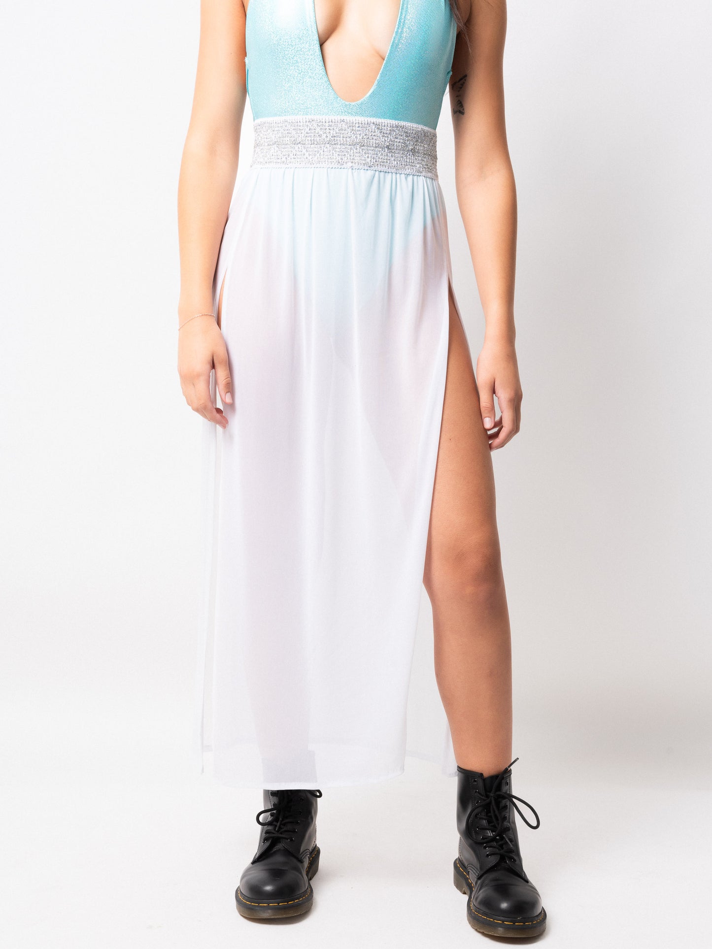 The FLOCK Moonchild Skirt features a shimmering silver elastic waistband, flowy mesh panels, and two front slits. Its maxi length, lightweight fabric, and breathable design make it perfect for hot summer days by the pool.
