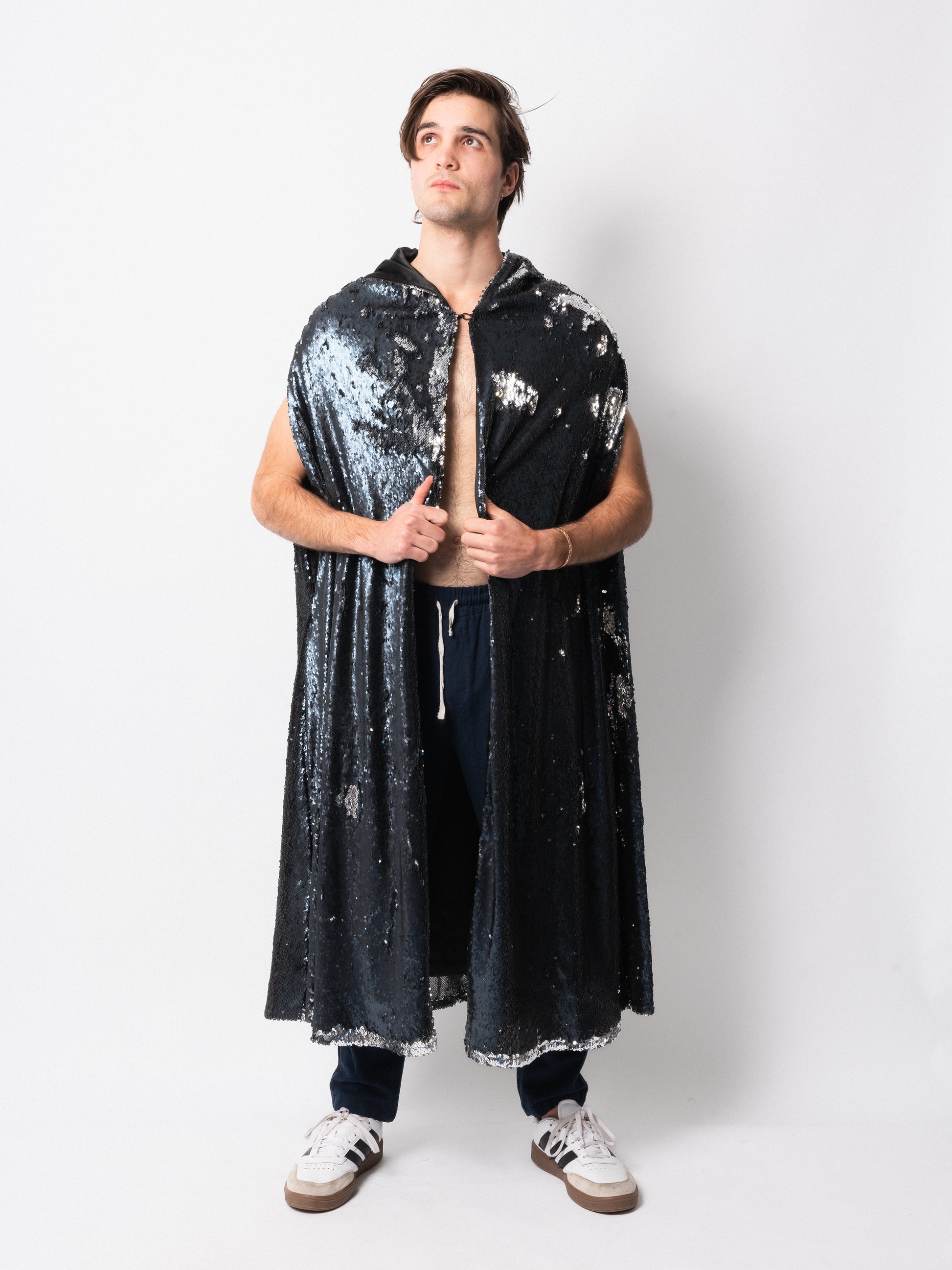 Dress To Express! Unisex Eclipse Cloaks that are definitely a statement. Reversable sequin fabric lined with lush satin. These bold garments feature maxi length, sequin throughout with a high-quality satin lining for extra comfort, they side and inside pockets. Consists of a hood and a clasp that clips near the upper chest. "Worn as a showstopper to a themed party or your favorite festival."